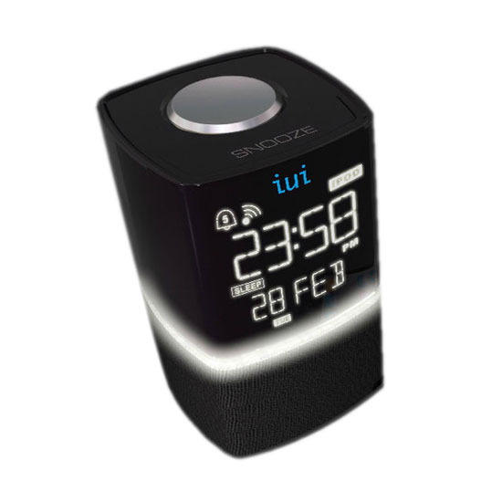- Stylish radio alarm clock with incoming message and missed call alert via icon prompt.