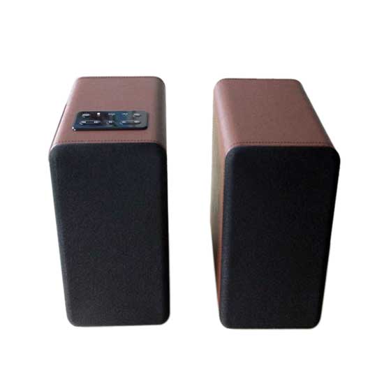 This Bluetooth loudspeaker features a brown and black hued appearance for a chic touch. It is fitted with a compact control panel on the top. This high quality Bluetooth loudspeaker is a great addition to your home theater.