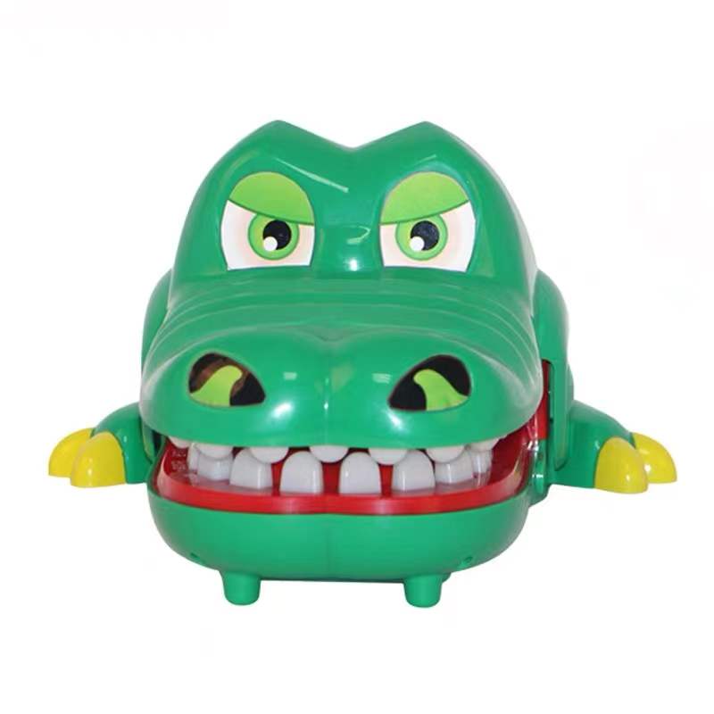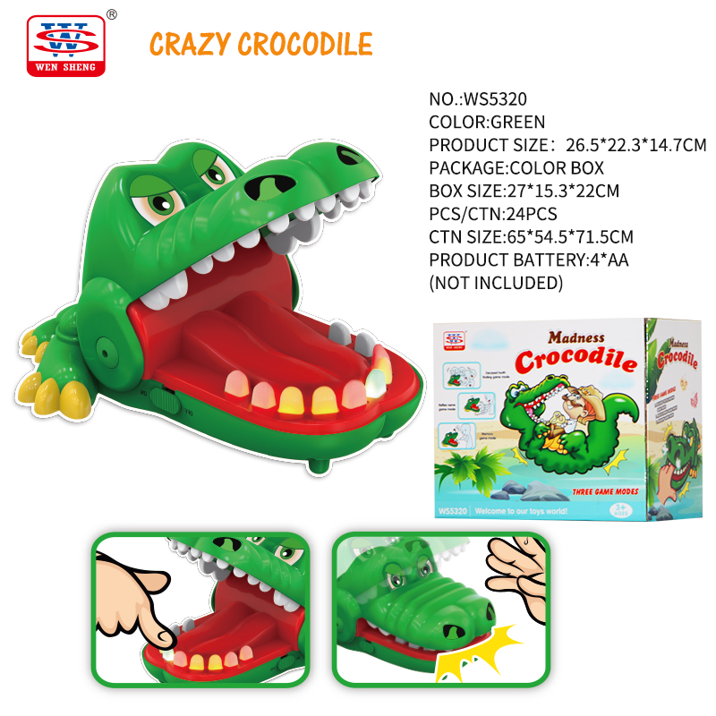 Please turn on the power switch and the crocodile's mouth opens and its teeth emit three colors of light, red, orange, and green, with the three colors representing the three modes of play.