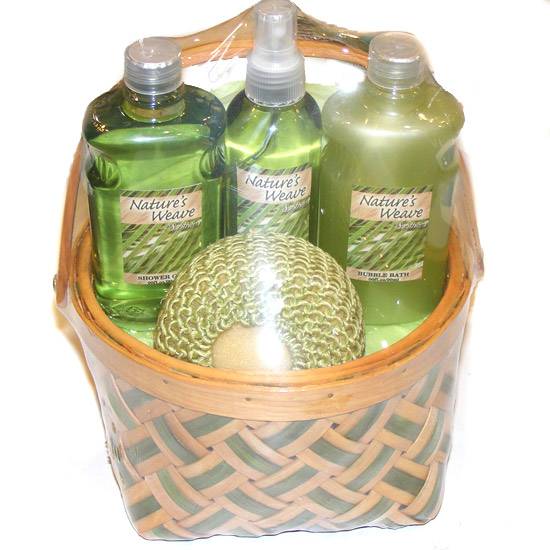 As shown is a bathroom set with a basket. It includes a body lotion, a body scrub, a bubble bath, a shower gel and a bath salt. The whole set is made of nature plant extracts which gives decent scent after shower.