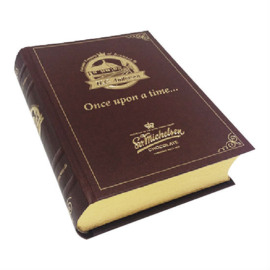 The displayed packaging box is designed to resemble a real book. It comes in a rectangular shape and is embellished with gold toned brand name and logo on the cover. This unique and classy design is excellent for packaging chocolate products.