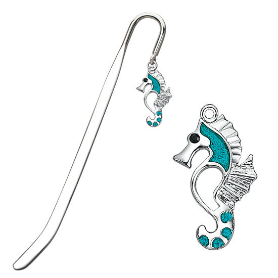 Make use of this bookmark to mark where you stop reading in a novel, digest or magazine. The slender and metallic dragonfly design delights in polished nickel plating, dangling an aqua-tinted seahorse pendant at its rounded hooking tip for added flair.