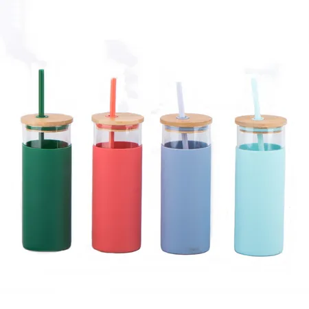 Borosilicate glass cup drinking bottle with wooden lid and plastic straw