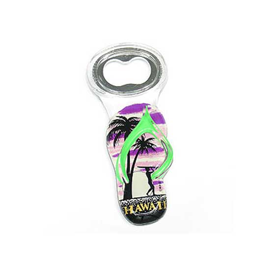 This bottle opener features a handle in the design of a flip-flop, displaying an extra unique style. The Hawaiian theme with vivid color prints flaunts added uniqueness. The special opener makes an ideal promotional gift.