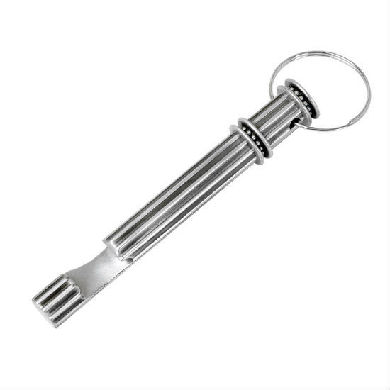 Open up a bottle of chilly beer with no fuss and no muss with this bottle opener. Masterly rendered with a ribbed exterior, the rod-shaped opener flaunts a rigid construction to unlock any tight bottle cap in a blink of an eye. Just slide it onto your key bunch to keep it close within reach.