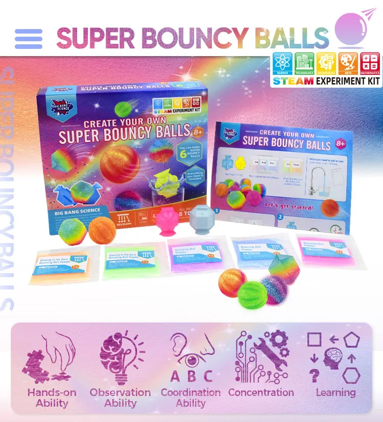 ducational Science Kit for Kids: Magic Bouncy Balls includes 5 Crystal powder bags. There are 6 different neon colors that you can make your unique ball. Magic bouncy balls provide a hands-on educational experience that sparks children's curiosity and problem-solving skills.