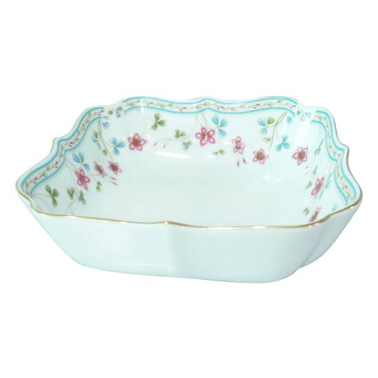 The featuring item is an elegant bowl for household use. The white square bowl is featured with flowers and leaves along the gold flute rim which shows a classy and refined style.