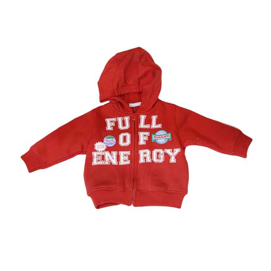 This is a hooded jacket with a zip front closure, an elastic hem and elastic cuffs. It is made of full cotton in allover bright red. The front is crafted eye-catching white words and badges for added style.