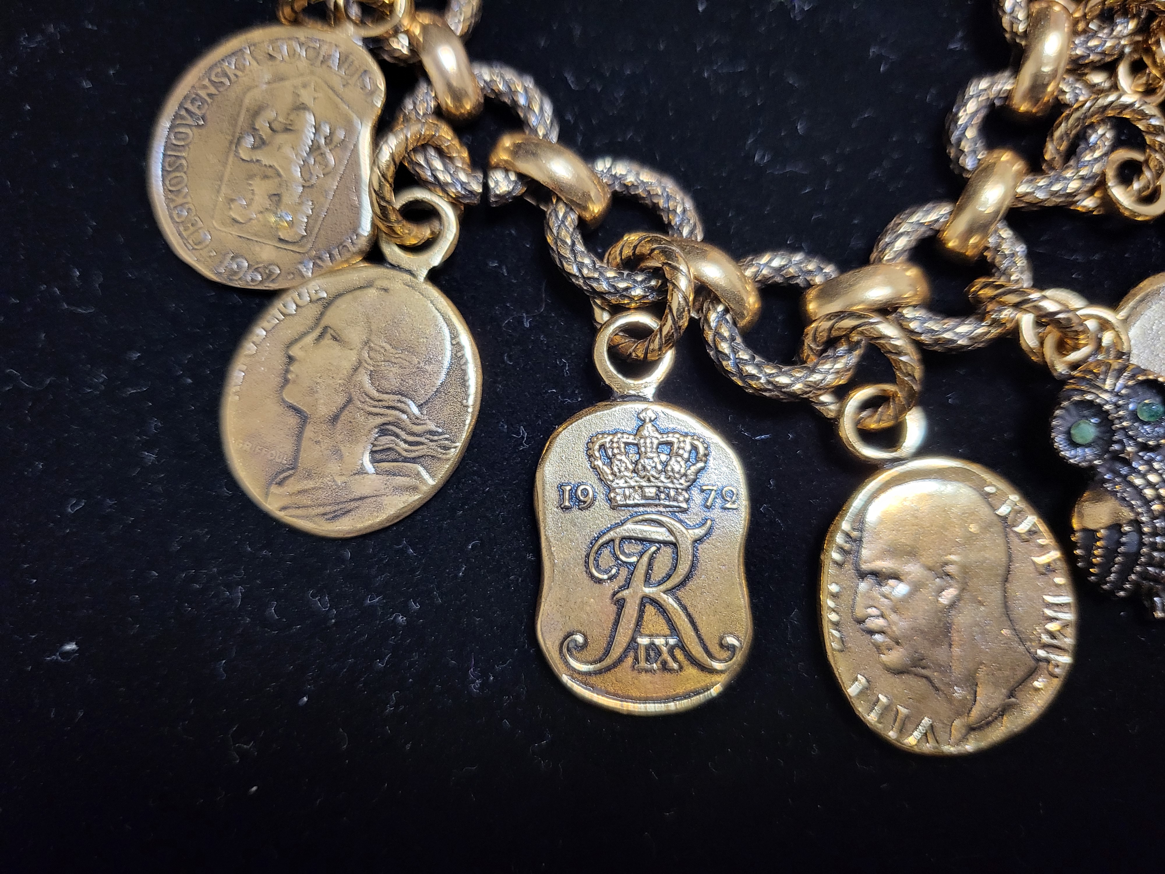 • Golden brass Bracelet with tiny rollò rings in a chain supporting coins from different parts of the worlds, worn and wrought, and an owl with emerald eyes
