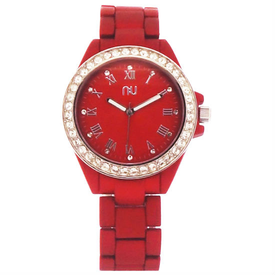 - Aluminum-effect oyster bracelet highlighted in maroon red.