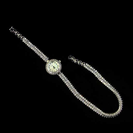Displayed is a bracelet watch that is completely decorated with sparkling stones for a fashionable style. The bezel is embellished with sparkling stones, which is echoed by the shiny hour markers on the dial. The entire watchband is made of pairs of sparkling stones, giving the timepiece a voluminous look.