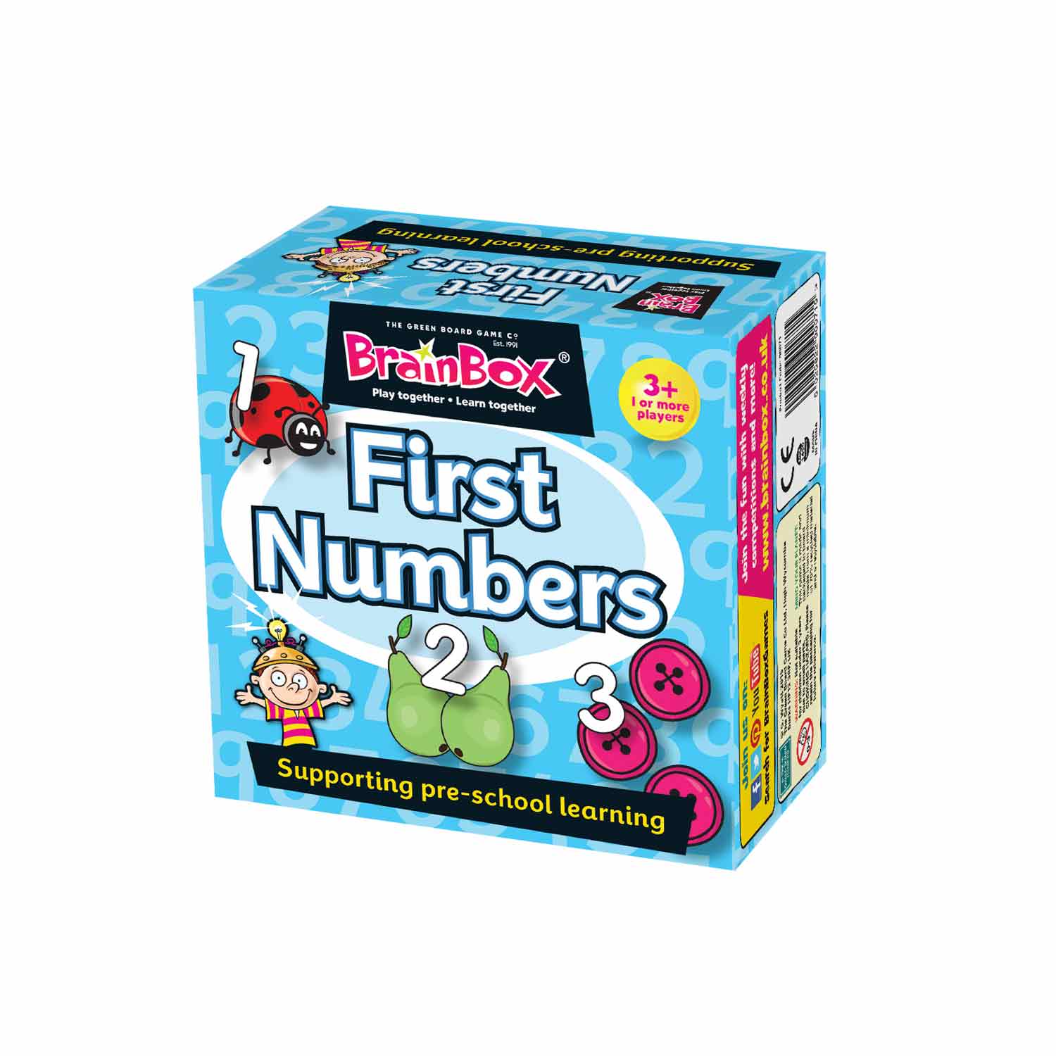 BrainBox First Numbers is designed to give pre-school children a head start. Each sturdy double-sided card shows three coloured images either showing different quantities or different numbers. As well as the game shown, the cards can also be used by children to talk about the images on the cards, or even tell a story that includes one or more of the images.