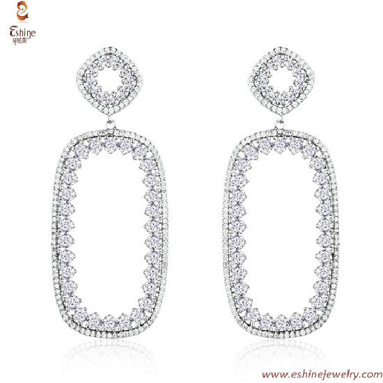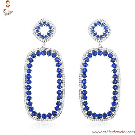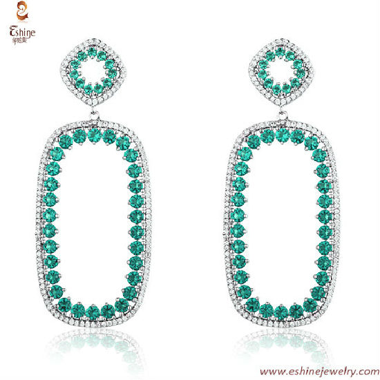 This dangling earring illustrates a combination of two open frameworks: one square one and one larger, oblong one at the bottom. Both parts presents round cubic zirconia stones in captivating colors and careful cuts, framed with a halo setting inlaid with sparkling specks of stones.