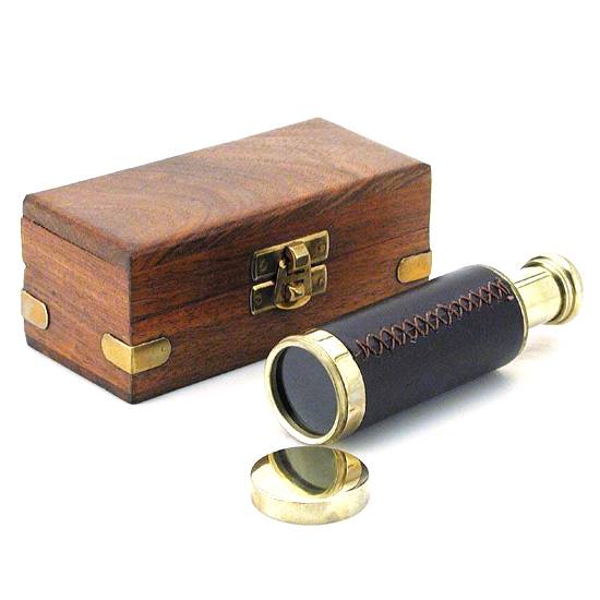 This is a decorative brass telescope. It is designed with leather body. This telescope packed in a wooden box.