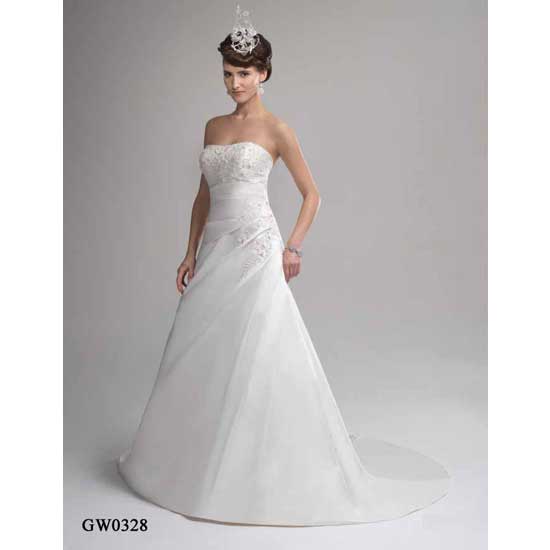 As shown is a bridal gown that is made of silky taffeta. The gown projects your sightly shoulders and alluring cleavage with a low neckline. Its bead-trimmed busts come along with the ruched waist and skirt.