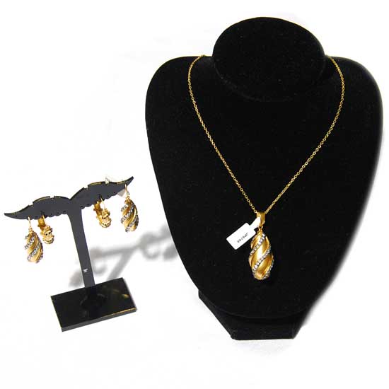The bronze jewelry set comprises a pendant, a necklace and a pair of earrings. The curved design gives a stylish touch to the jewelry, while the CZ accents offer added elegance and sparkles. Add a touch of glamor to your style with this bronze jewelry set.