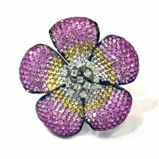 Embellished with rubies, pinks sapphires, yellow sapphires and diamonds in pave setting.
