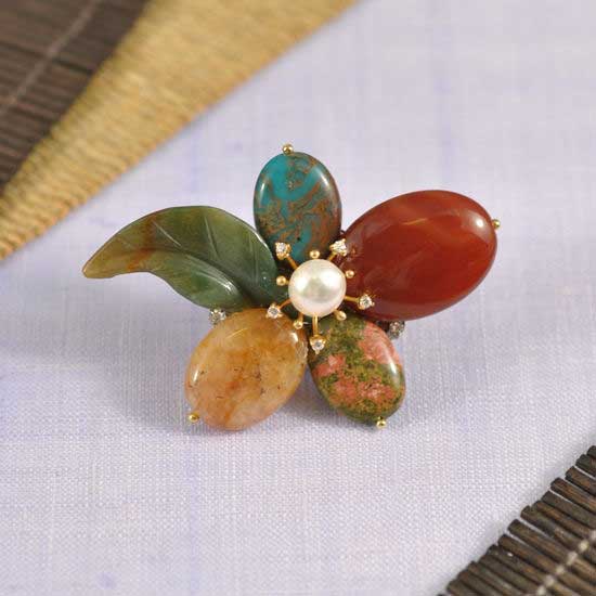 This brooch/pendant stands out from others with its delicate floral design with vivid grains. It is made of sard, agate, turquoise, jasper and topaz for richness. This dainty brooch/pendant is a delightful gift for ladies.