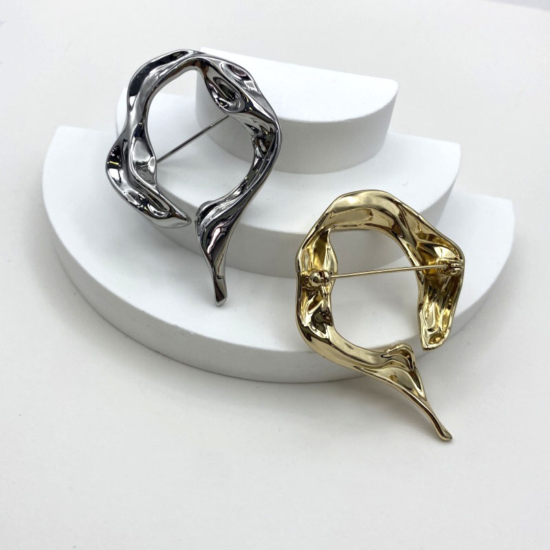 This brooch uses a liquid metal texture as its core design language, breaking the traditional constraints of a regular circular shape to create an irregular, twisted form full of artistic sense. The smooth metal surfaces reflect a delicate luster, combining a niche design aesthetic with a sense of sophisticated luxury, making it a highlight accessory to enhance the refinement of any outfit.