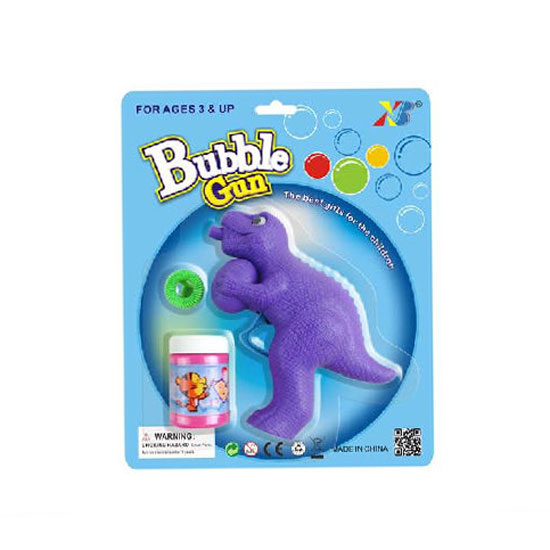 This is a toy bubble gun designed in a cute dinosaur shape. It is well packaged in a blister card. This interesting item is an ideal outdoor toy for little children to play with.