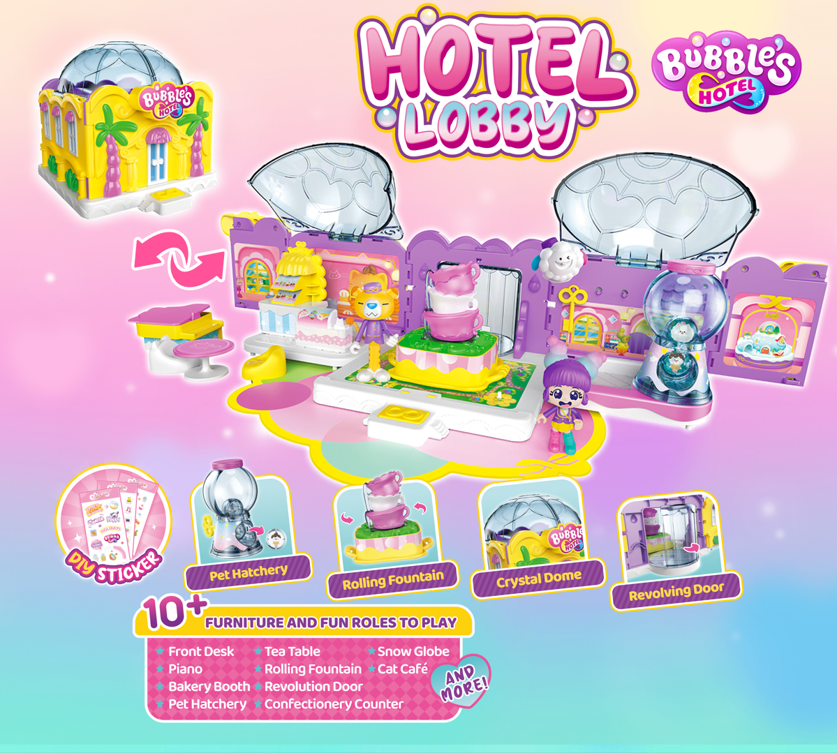 梦幻的泡泡酒店大堂,有超丰富的配件和魔法音乐喷泉,宛如置身寻梦泡泡岛酒店动画一般!快来和泡泡迎接今天的客人吧!