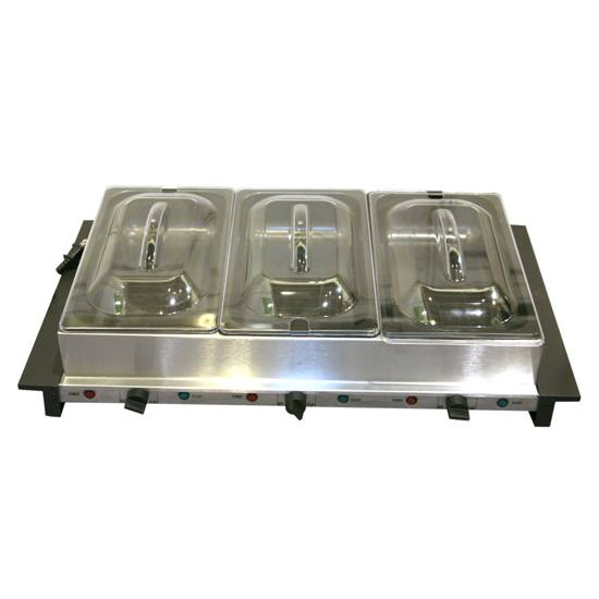 This buffet server set is usually seen in hotels or restaurants. It includes three stations for three types of food. The biggest advantage is its ability to keep the food warm, so when customers pick up the food, it is still hot and fresh. The easy-to-open lids keep the food away from the pollutants in the external environment, while letting customers easily access to the food when necessary.