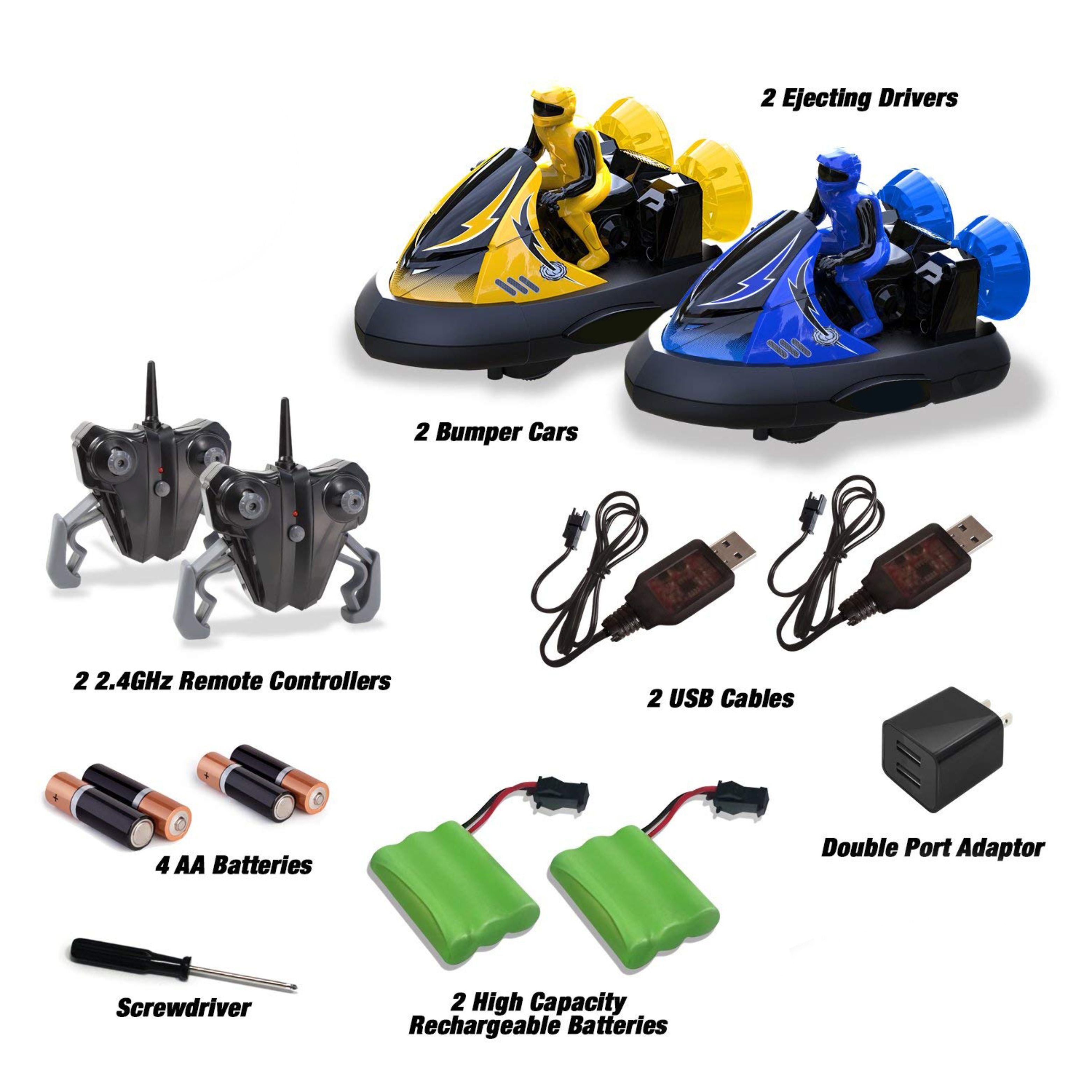 Get hooked to a head-to-head bumper car tournament with this remote-control car set. Bundled with two bumper cars, two powerful remote controllers and two high capacity rechargeable batteries, the fun-fueled playset has got everything you need to kick off a spine-tingling game anytime and anywhere. Just get set on the controller and prepare to knock down your opponent at once by twiddling the thumb sticks like a pro when you hear the horn.