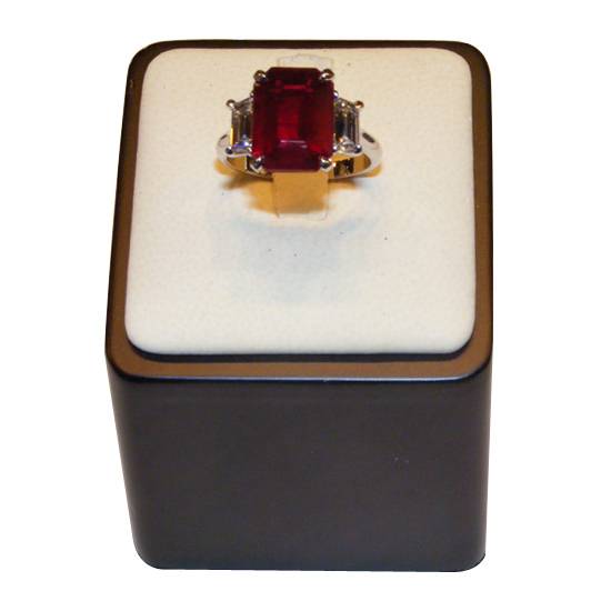 Featured is a ruby ring. It comes with a ruby in emerald shape in step cut. The ruby is well mounted on the ring in 4-prong setting. There are white stones in baguette cut on both sides as decorations.