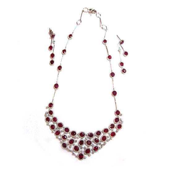 The Burmese pigeon blood ruby set includes a necklace and earrings. Each item is also constructed of 18K gold and diamonds for enhanced glamor. This set offers an effortless way for you to create an elegant, uninterrupted party look.