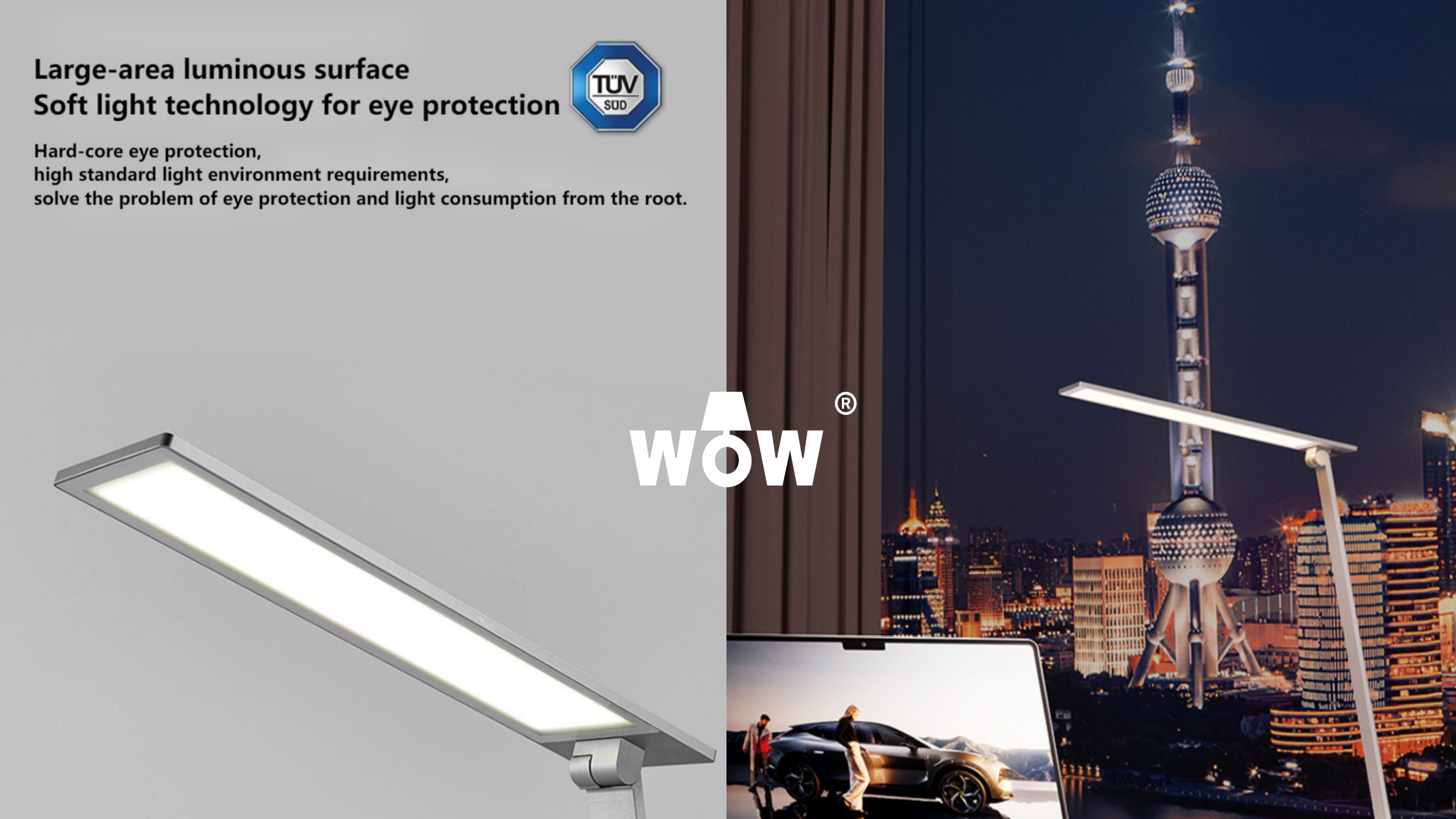 Large-area luminous surface, Soft light technology for eye protection.