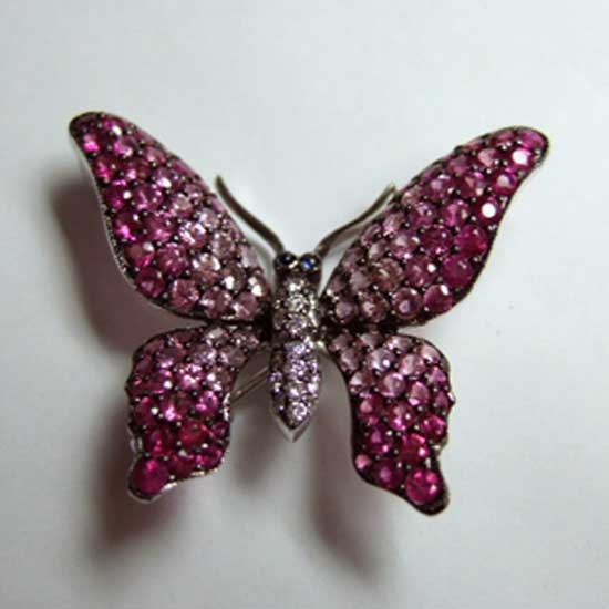 This talented butterfly rest either on your chest or neck as a brooch or a pendant. The butterfly is dressed in romantic pink hues. This little butterfly shows its grace with the help from pink sapphires and rubies.