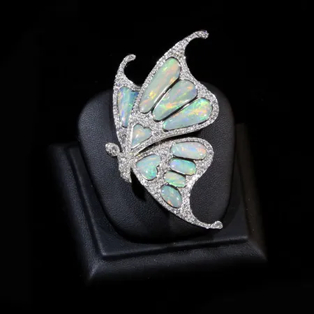 This butterfly brooch is meticulously crafted with opal and diamonds. The glittering opal stones exhibit excellent fire and incandescence. The sparkling white diamonds greatly enhance the glamour of the piece.