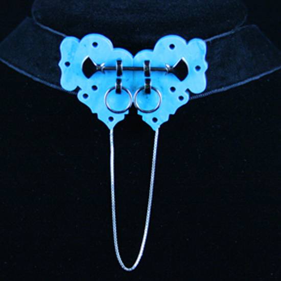 This is a designer choker. The choker is made of sterling silver electroplated in gun metal colour and turquoise stone. It is designed in the form of butterfly.
