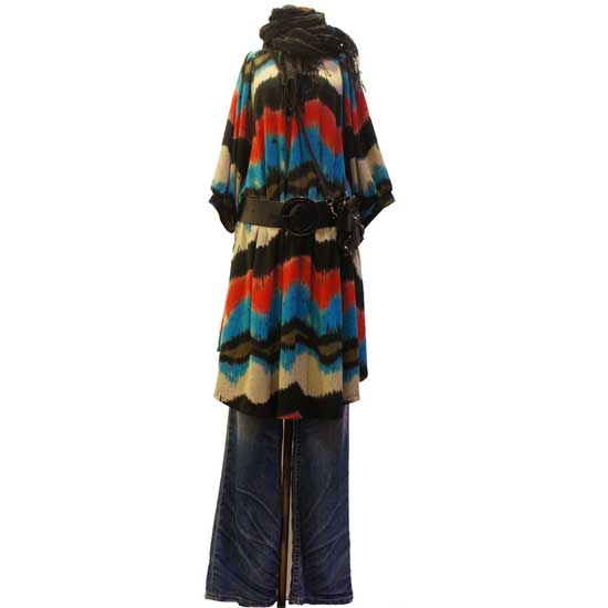 This ladies' blouse features a charming design with a long construction. Multi-color patterns in red, blue and beige decorates this top. This playful, bold garment can be paired with leggings or jeans for a relaxed look.