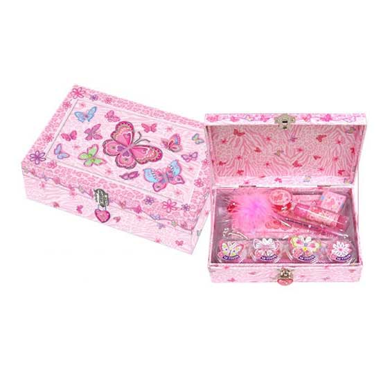 Featured is a fancy trinket box designed in pink with butterfly patterns. The metal lock comes with a heart-shaped charm. The compartments allow easy storage of items.
