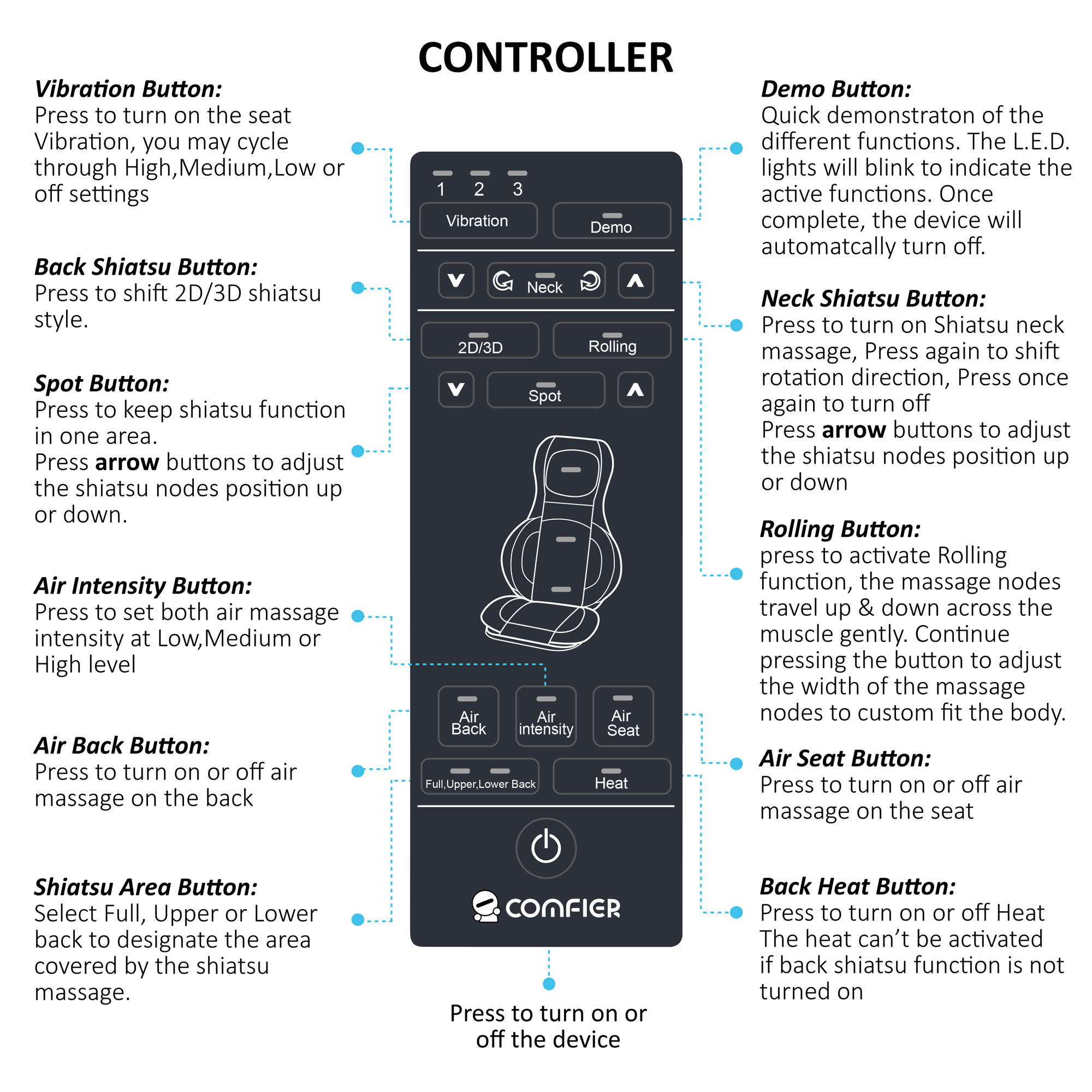 3. Air massage on seat & back with at L-M-H intensities.