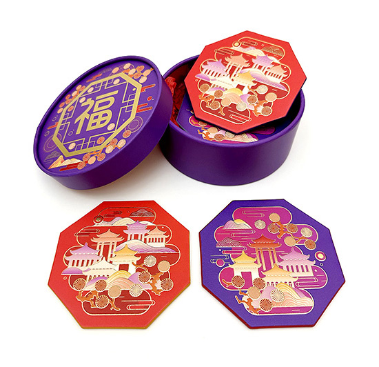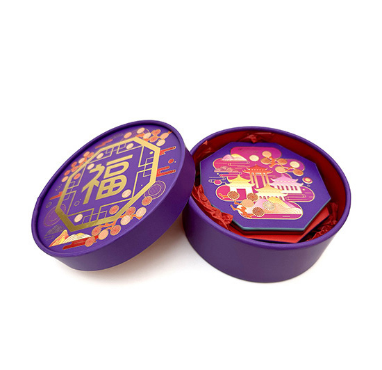 This circular paper tube box is designed to hold four exquisite coasters. The box and coasters are produced with a variety of techniques, including cold stamping, spot UV, edge printing, and multi-embossed effects. A unique design effort in keeping with current packaging trends and catering to users' expectations of quality and elegance. And an edge printing gives the coaster a beautiful pattern or color scheme on your own idea.