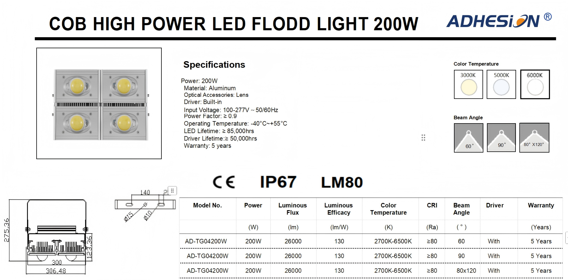 3.Offers outstanding light efficiency with a whole lamp efficiency of 140-150lm/W, making it a suitable replacement for standard LED floodlights of 1500W in the market while providing the same illuminance level.