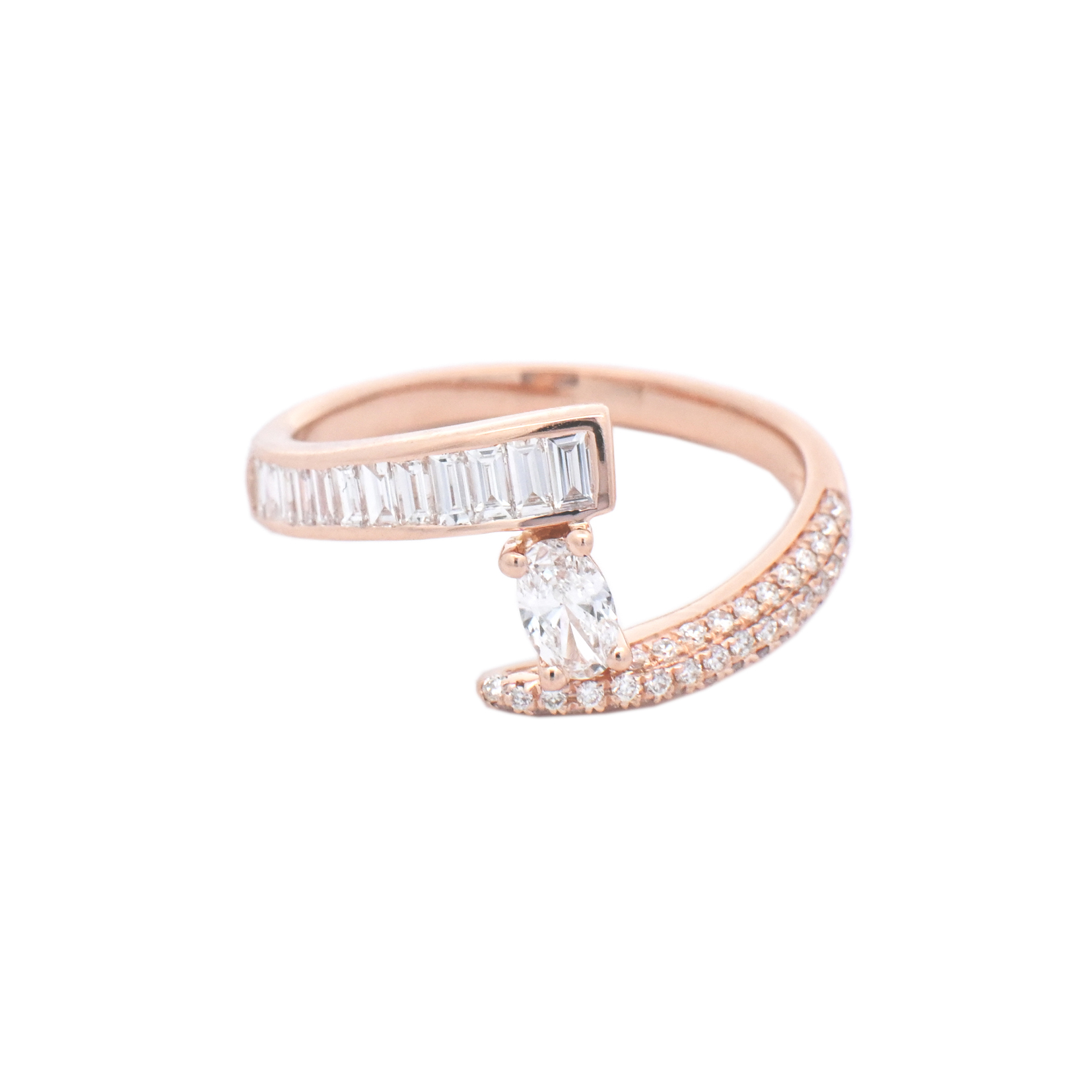 This beautiful diamond ring attracts everyone's attention with its unique design and sparkling light. The ring is made of high-quality rose gold and set with brilliant diamonds, which perfectly shows the nobility and elegance. Whether it is daily wear or special occasions, this ring is made of gold and set with brilliant diamonds