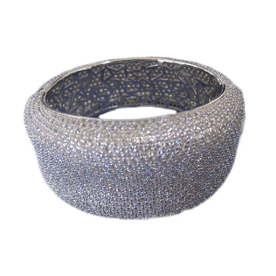 This big bangle is wonderfully adorned with packed cubic zirconia stones. The sparkling stones shine with incredible glamour. Their dazzling, reflected light can be compared to that of diamonds.