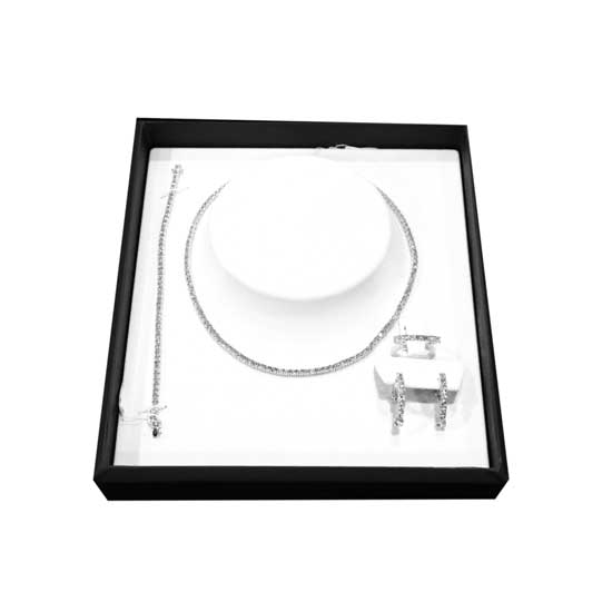 This four-piece jewelry set includes a finger ring, a pair of earrings, a necklace and a bracelet. The classy jewelry pieces are micro-paved with twinkling white stones on the silver setting. The jewelry set will add charm to your daily look.