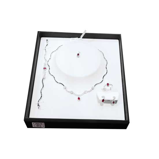 This exclusive CZ jewelry set includes a necklace, a ring, a bracelet and a pair of earrings. The jewelry pieces are adorned with oval-cut red CZ stones and tiny white stones. The necklace and bracelet showcase a wave design on the polished silver bands.