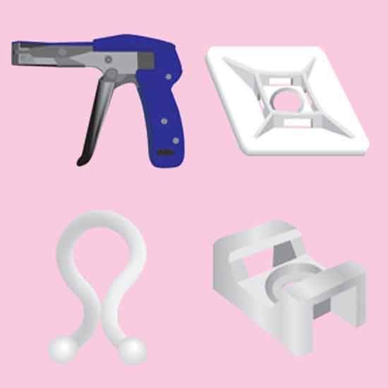 Featured is a series of cable accessories including a reusable twist tie, a cable tie mount, a saddle tie mount and a cable tie tool. The cable tie tool can cut cable ties precisely without making any sharp edges. The reusable twist tie offers fast and strong bundling of wires, cables, cords and pipes. The cable tie mount secures cables with the use of a screw.