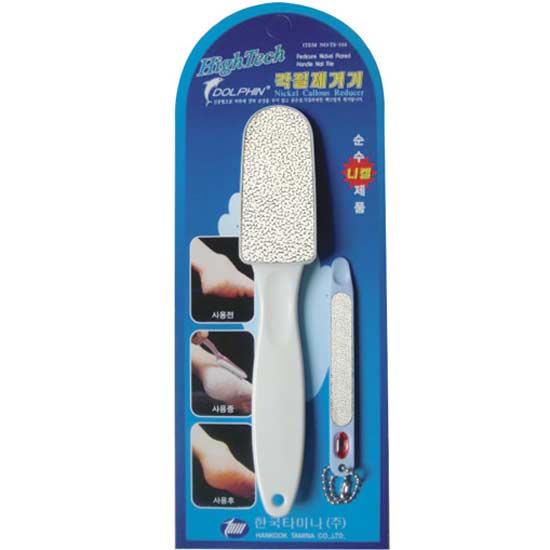 This callus remover and nail file are made of plastic and nickel. The items are handy and easy to use in removing callus and beautifying your nails. They come with hanging holes and rings for easy storage.