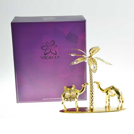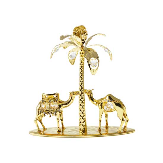 This home decoration is designed with two 24K gold plated camels and a palm tree. This camel decoration is finely made with great craftsmanship and delicate details for an attractive look. The dazzling Swarovski crystal stones are added for an elegant touch.