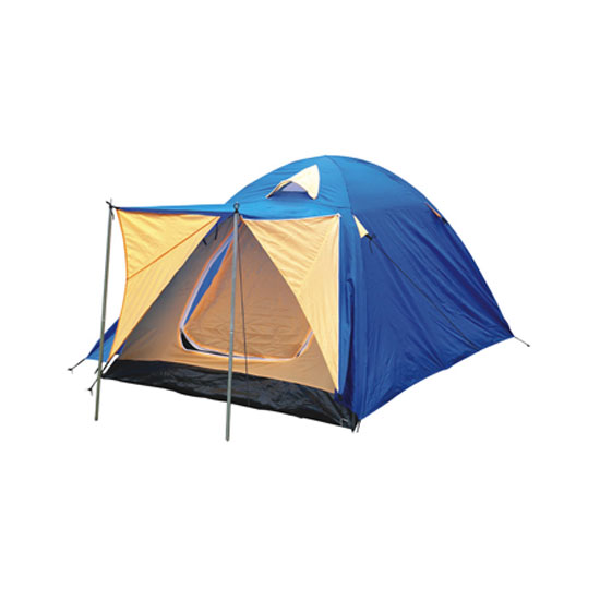 This is a camping tent with a robust frame for enhanced durability. It boasts a two-colored appearance in blue and yellow. Featuring a folding design, it allows easy storage and packing.