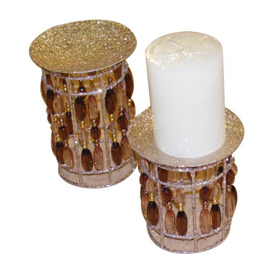 These candle holders have small sparkling plates supported by frames with beads trimming. There are 3 shapes of beads in three similar colors similar for the beads trimming. With is gorgeous style, it is suitable to be use as a Christmas decoration.