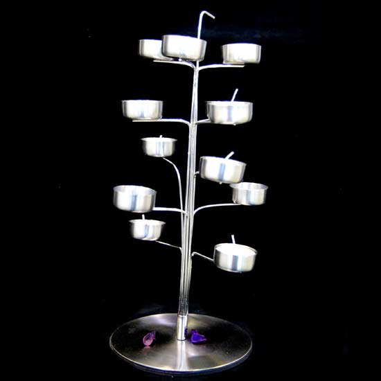 Displayed is an artistic candle holder that is crafted of fine stainless steel material. This beautiful tree-shaped candle holder is designed with 12 candle holders on 12 branches. Look no further for the ideal gift idea with this candle holder.