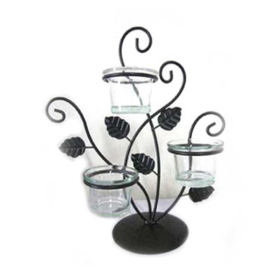 This alluring candle holder comes with a black metal frame with curving details and leaves. It is fitted with three cylindrical glass holders. This refined candle holder is ideal for home or hotel decoration.