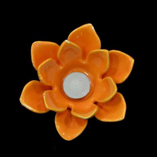 This is a candle stand designed in a beautiful flower shape in brilliant orange. It features a delicate ceramic structure with exquisite details. Add a touch of elegance to your home with this dainty piece.